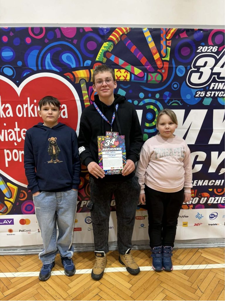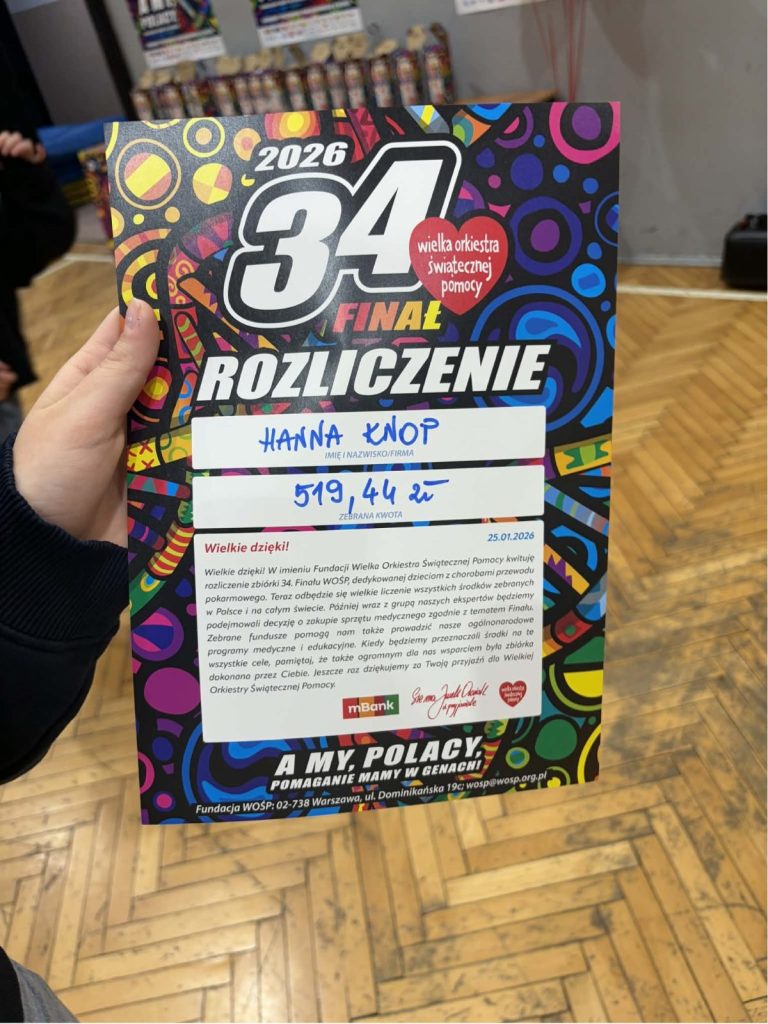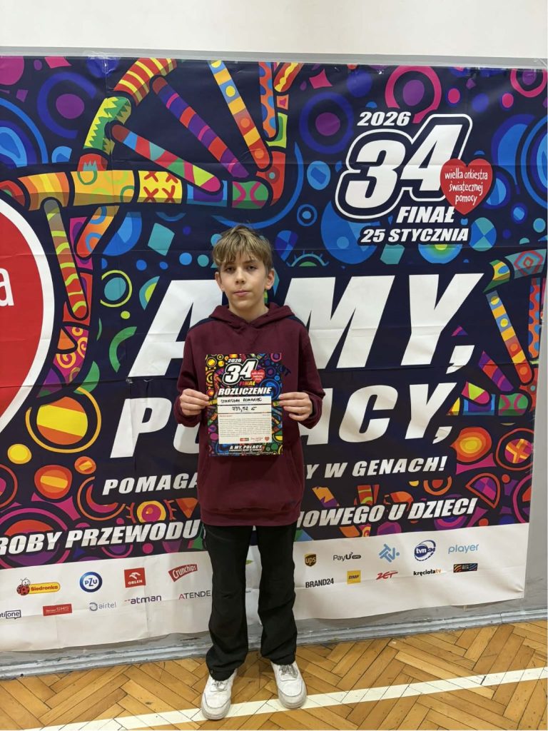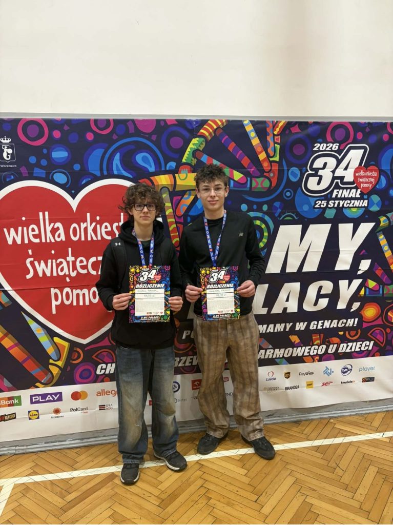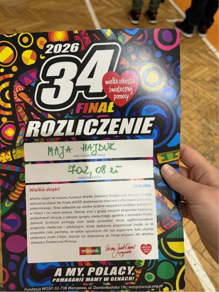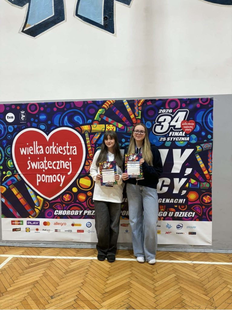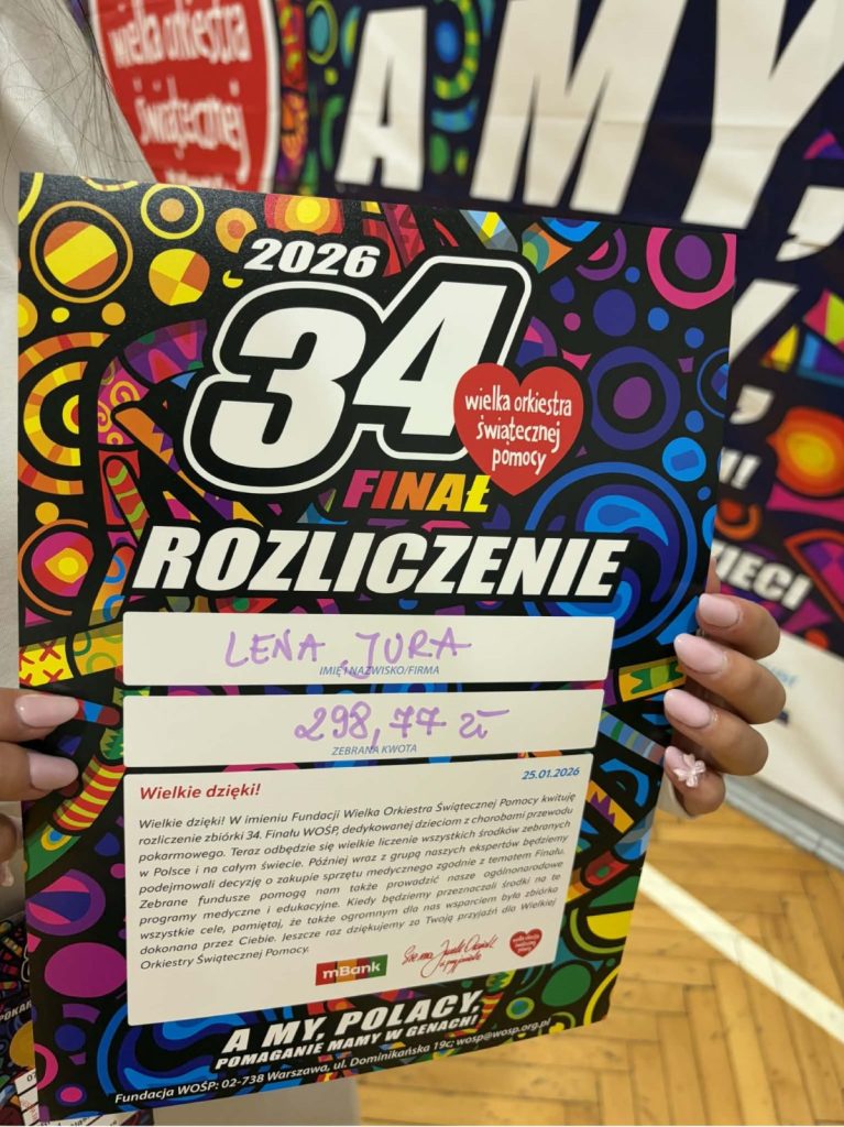 Z ogromną dumą i wzruszeniem dziękujemy uczniom naszej szkoły, którzy wzięli udział w 34. Finale Wielkiej Orkiestry Świątecznej Pomocy. Wasze zaangażowanie, otwarte serca i gotowość do niesienia pomocy innym pokazują, że dobro naprawdę ma moc — a Wy potraficie je pięknie pomnażać.