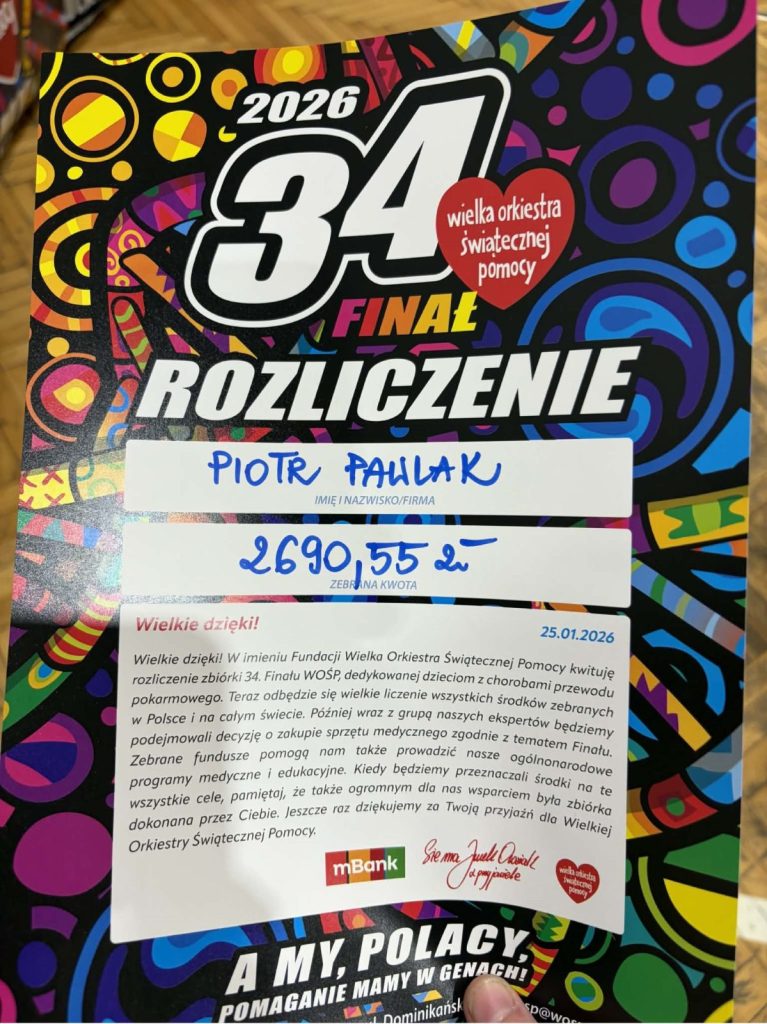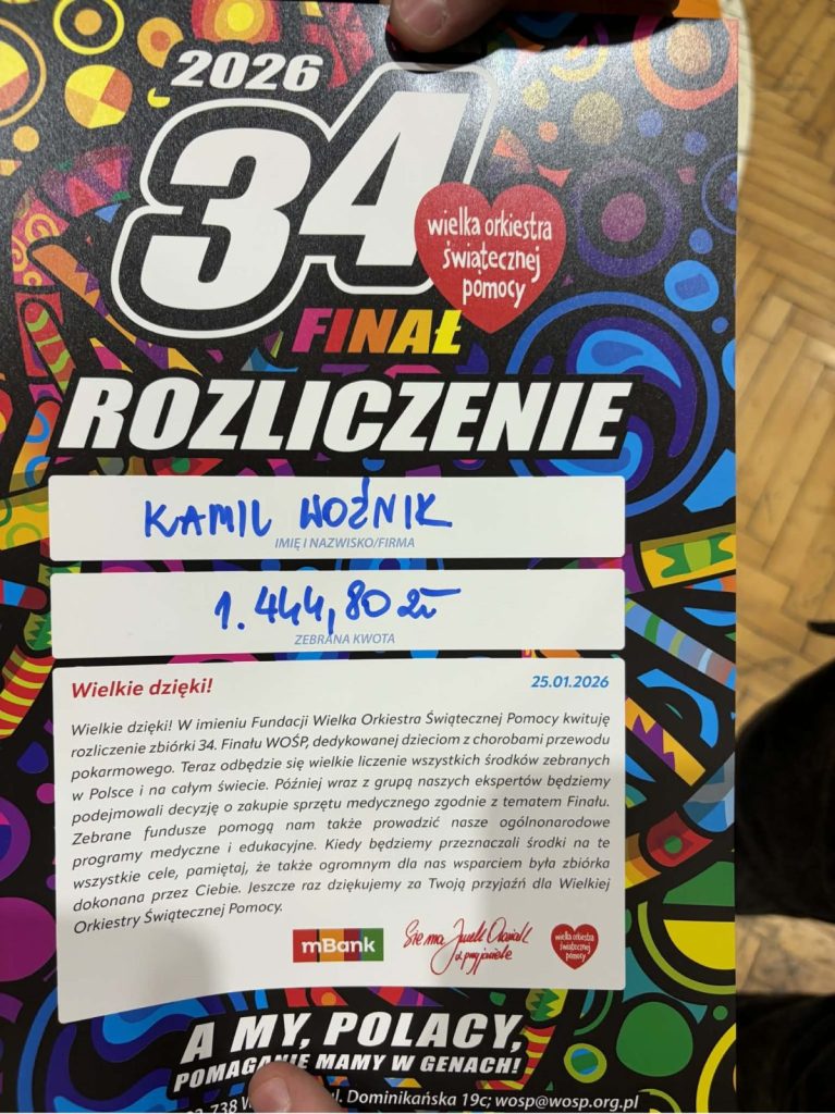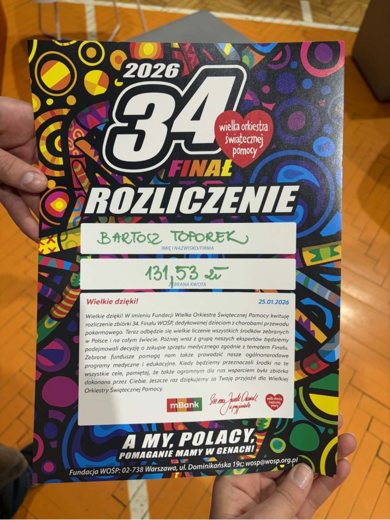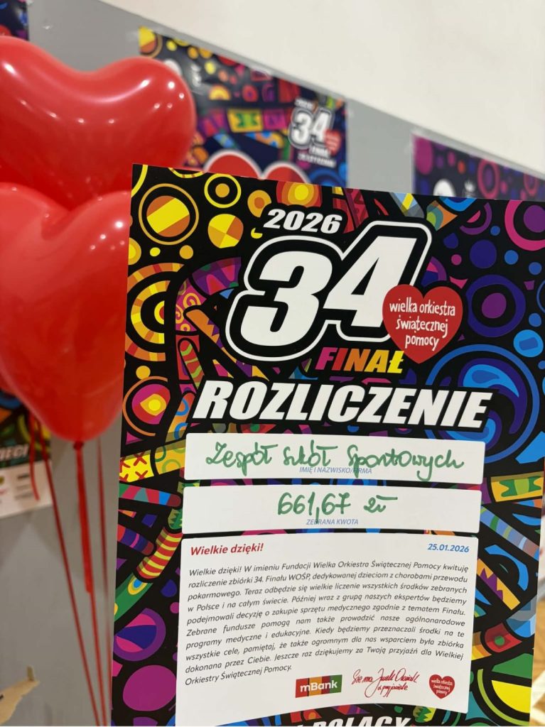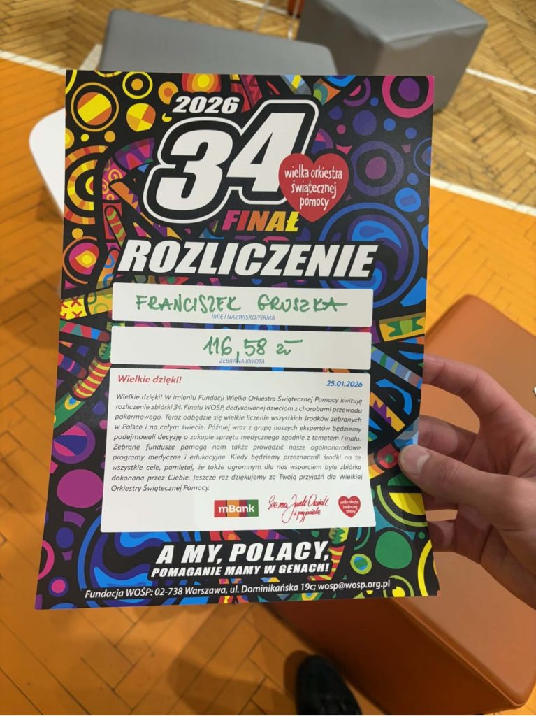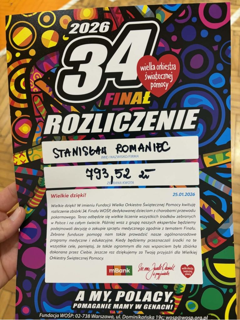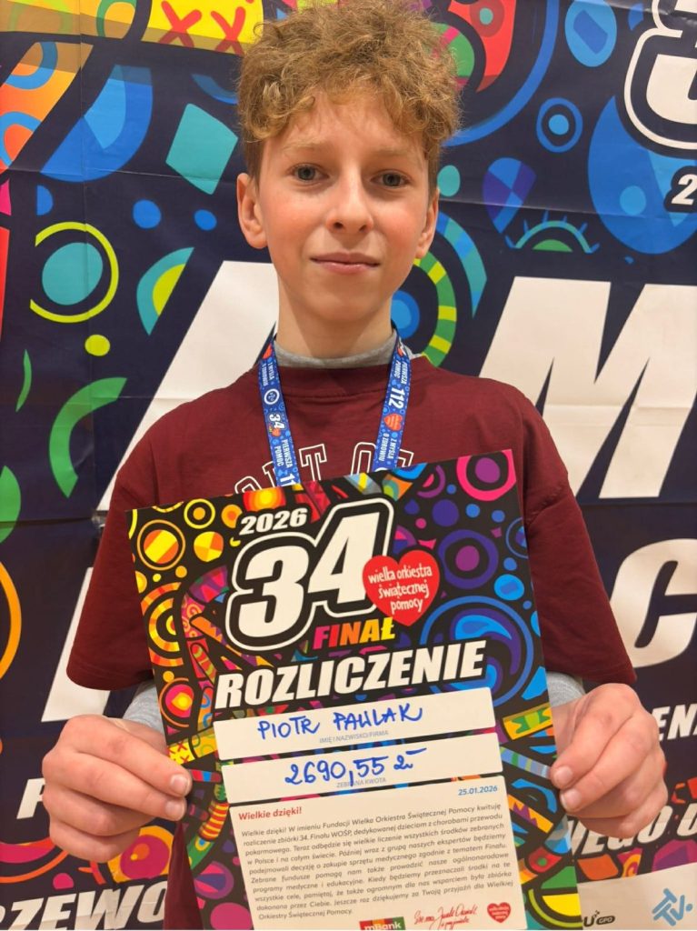 Z ogromną dumą i wzruszeniem dziękujemy uczniom naszej szkoły, którzy wzięli udział w 34. Finale Wielkiej Orkiestry Świątecznej Pomocy. Wasze zaangażowanie, otwarte serca i gotowość do niesienia pomocy innym pokazują, że dobro naprawdę ma moc — a Wy potraficie je pięknie pomnażać.